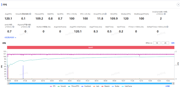 游戏平均帧数120.1fps,波动指数0.1,1%low也有109fps ,帧数这块的完美无需多言。