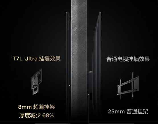 TCLT7LUltra搭载了天花板级的音频硬件配置同时,也具备比同价位产品薄20%的一体化机身设计,搭配专用超薄磁吸挂架时,可实现更加严丝合缝的贴墙安装,为简约家居美学添彩。