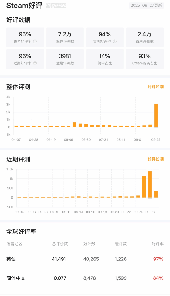 此外,《哈迪斯2》近期评测为好评如潮,简中玩家好评率为84%,而游戏的好评数从正式版发售前后数量激增,显然正式版的质量获得玩家的高度认可。