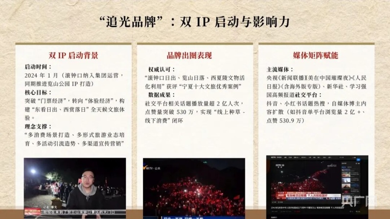 近年来,银川文旅集团重点聚焦“促进文旅消费、带动产业升级”,紧紧围绕“多消费场景打造、多形式旅游业态培育、多活动引流造势、多渠道宣传营销”的新文旅发展理念,深度挖掘旗下景区及览山公园等优质资源,成功打造了“滚钟口·日出之约”与“览山落日之约”两大标志性文旅IP,逐步形成“东看日出、西赏落日”的全天候、多场景文旅体验新格局。